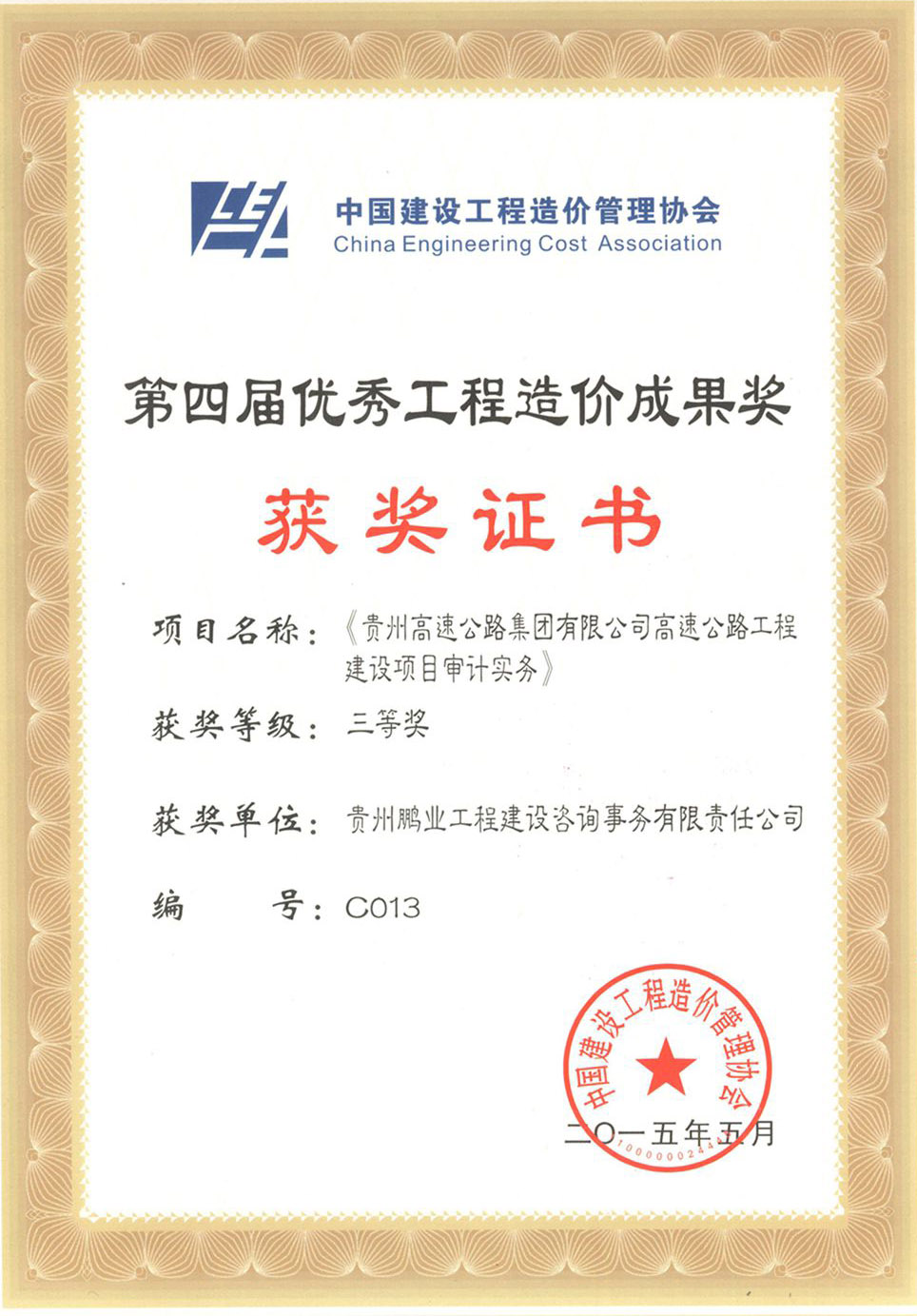 獲得中國(guó)工程造價(jià)協(xié)會(huì)頒發(fā)的第四屆工程造價(jià)優(yōu)秀成果三等獎(jiǎng)